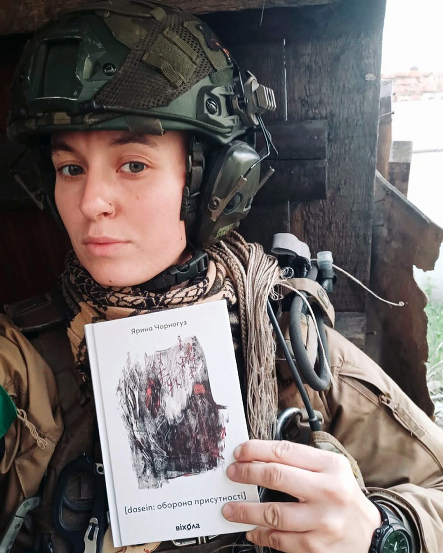 Soldaat en oorlogsdichter Yaryna met dichtbundel